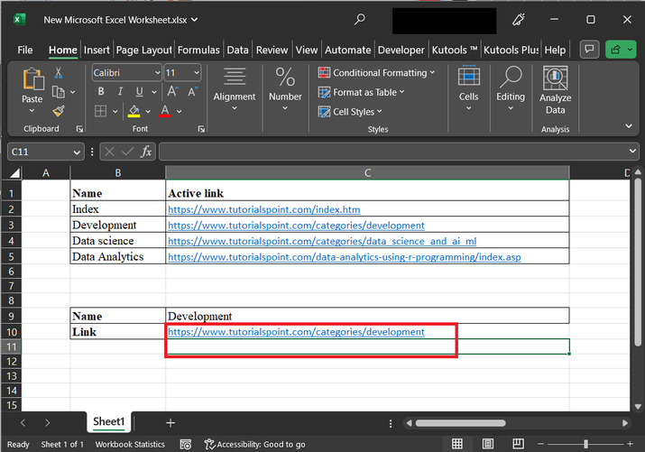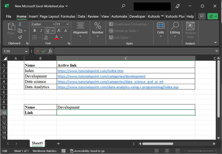 為了理解從 Excel 表格中提取活動超連結的過程,請考慮以下提供的 Excel 表格。此 Excel 表格包含兩列。第一列包含超連結的相關名稱資訊,而第二列包含活動連結的資料。之後,轉到 B9 單元格並鍵入名稱“開發”。然後,轉到 B10 單元格並鍵入列標題“連結”。將 C10 單元格留空。此單元格將儲存相關的超連結。C9 單元格包含所需超連結的名稱資訊。