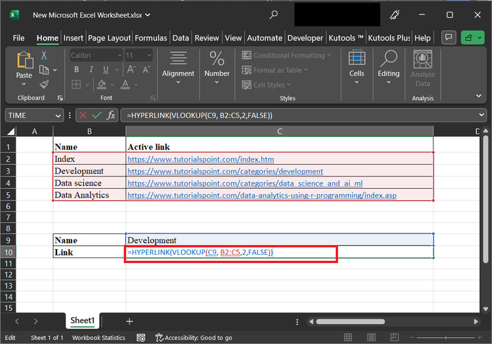 HYPERLINK (VLOOKUP (C9, B2:C5, 2, FALSE)) − 上一個函式 VLOOKUP 的結果將作為引數傳遞給此函式,這對於在 Excel 中建立具有可點選連結的超連結至關重要。在本例中,VLOOKUP 函式的結果用作超連結的 URL 或地址。