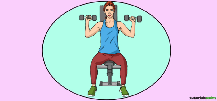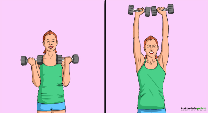 步驟 1 − 首先,您可以嘗試單臂肩部推舉來鍛鍊三頭肌和二頭肌。這需要啞鈴。必須呼氣和吸氣,同時向上和向下推啞鈴。可以嘗試連續做 8-10 次。