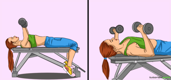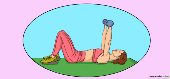 步驟 2 − 下一個是它的修改版本,啞鈴臥推。需要躺在長凳上,然後呼氣和吸氣時向上和向下推啞鈴。