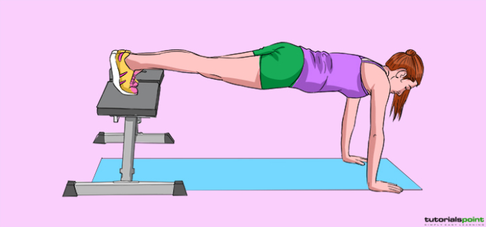 步驟 3 − 下一個方法是傾斜俯臥撐。需要一個長凳,你需要將腿放在上面,然後做俯臥撐。這會使胸部和上半身部分承受身體壓力,並有助於燃燒脂肪。