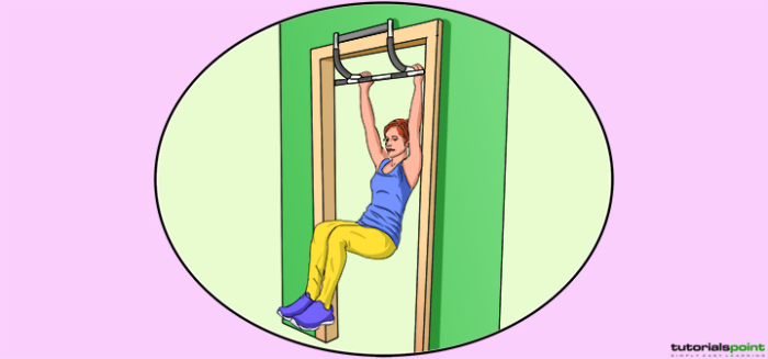 首先,我們將討論引體向上−為此,需要一個特殊的裝置。需要一個引體向上杆。你應該抓住杆子的把手,然後上下移動,給肩膀和手臂施加壓力。根據需要呼氣和吸氣。您可以向下支撐以控制過度壓力。