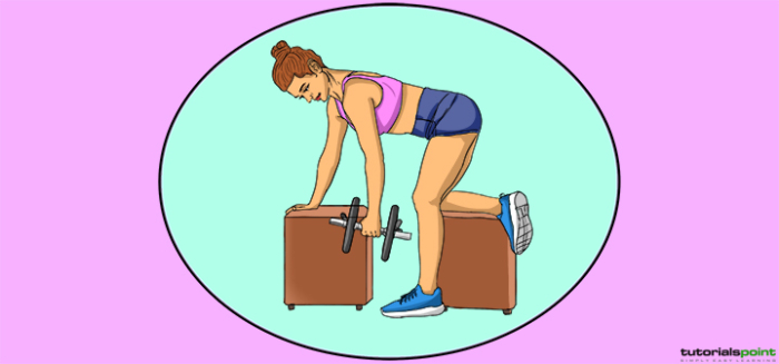 彎腰後束提拉是我們下一個練習−首先,讓自己坐在長凳上,用一個膝蓋和一隻手支撐在地面上。用另一隻手握住啞鈴,並嘗試將其上下抬起。這使得肩部和手臂得到很好的鍛鍊。用其他手指也做這個動作。重複此係列 6-8 次。