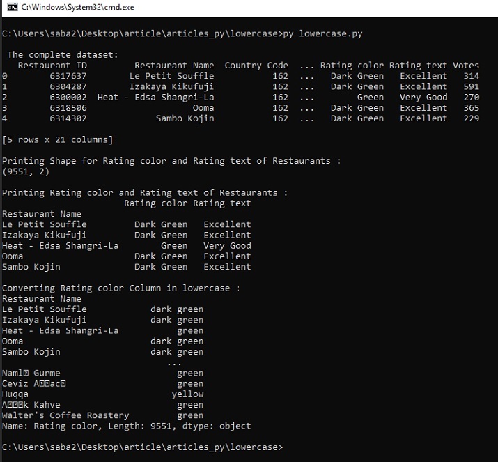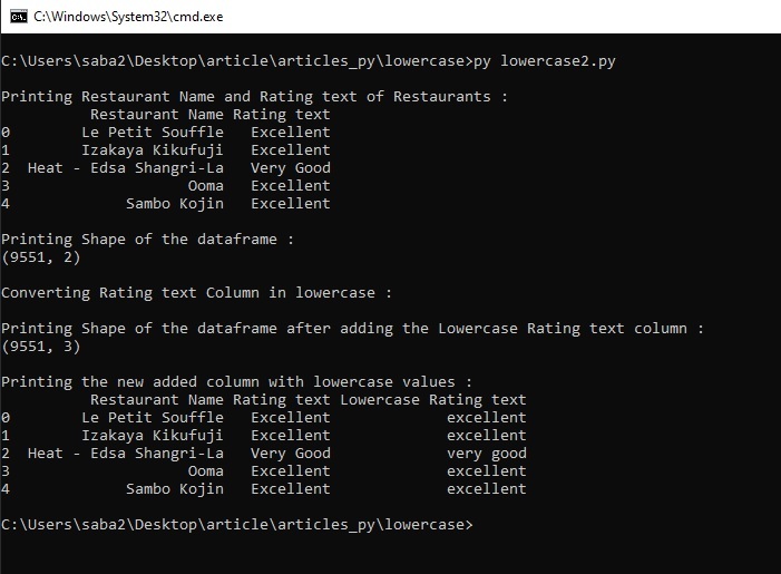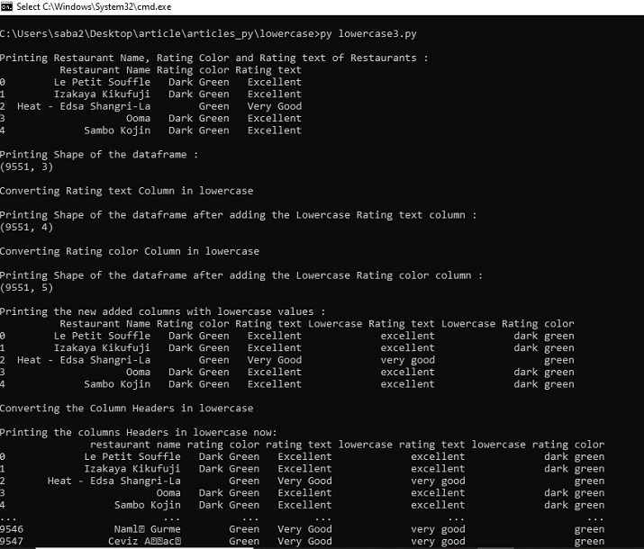import pandas as pdd dff2 = pdd.read_csv('C:/Users/saba2/Desktop/article/articles_py/tsv/zomato.csv', sep=',',usecols=['Restaurant Name', 'Rating color', 'Rating text']) print("\nPrinting Restaurant Name, Rating Color and Rating text of Restaurants : ") print(dff2.head()) print("\nPrinting Shape of the dataframe : ") print(dff2.shape) print("\nConverting Rating text Column in lowercase") dff2["Lowercase Rating text"]= dff2['Rating text'].apply(lambda x: x.lower()) print("\nPrinting Shape of the dataframe after adding the Lowercase Rating text column : ") print(dff2.shape) print("\nConverting Rating color Column in lowercase") dff2["Lowercase Rating color"]= dff2['Rating color'].apply(lambda x: x.lower()) print("\nPrinting Shape of the dataframe after adding the Lowercase Rating color column : ") print(dff2.shape) print("\nPrinting the new added columns with lowercase values : ") print(dff2.head()) print("\nConverting the Column Headers in lowercase") dff2.columns = map(str.lower, dff2.columns) print("\nPrinting the columns Headers in lowercase now: ") print(dff2)