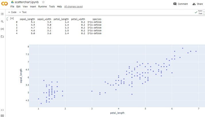 步驟6 - 編寫函式以顯示散點圖。透過單擊給定程式碼單元格上的播放按鈕來執行程式。檢查結果,因為它將在colab筆記本中顯示。