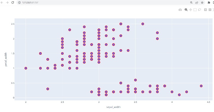 #include the required libraries import pandas as pd #This library is needed to make the scatter plot import plotly.express as pxx #read the CSV file and make a dataframe dff = pd.read_csv("IRIS.csv") #print the columns and data print(dff.head()) #make the scatter plot figg = pxx.scatter(dff, x="sepal_width", y="petal_width") #set the properties of the scatter plot figg.update_traces(marker=dict(size=12, line=dict(width=2, color="red")), selector=dict(mode='markers')) #display the chart figg.show()