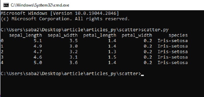 此CSV檔案包含五列,分別命名為sepal_length、sepal_width、petal_length、petal_width和species。在這些列中,我們將使用sepal_width和petal_width用於示例1中的散點圖,以及sepal_length和petal_length用於示例2中的散點圖。