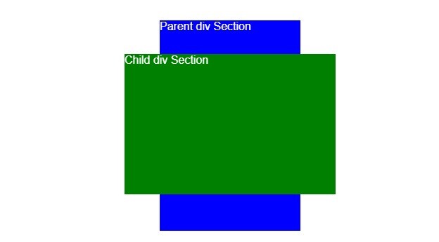 <!DOCTYPE html> <html> <head> <title>Make a Child div Element Wider than Parent div</title> <style> body { display: flex; justify-content: center; font-family: Arial, sans-serif; min-height: 100vh; margin: 0; align-items: center; } .parent { width: 200px; height: 300px; background-color: blue; color: white; overflow: visible; } .child { width: 300px; height: 200px; background-color: green; position: relative; left: -50px; top: 30px; color: white; } </style> </head> <body> <div class="parent"> Parent div Section <div class="child"> Child div Section </div> </div> </body> </html>
