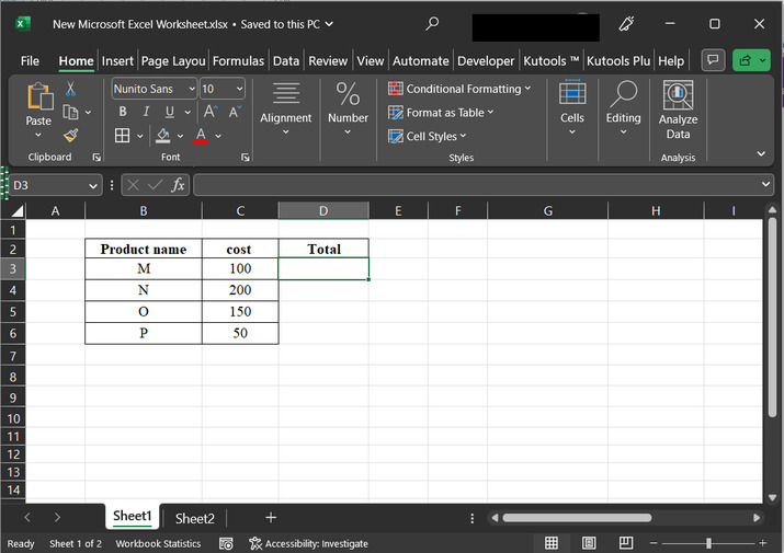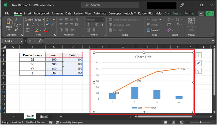 要了解在Excel中建立累積和圖表的流程,假設提供了一個Excel工作表。此Excel工作表包含兩列。第一列包含產品名稱資料,第二列包含成本資料。最後,第三列包含空格。