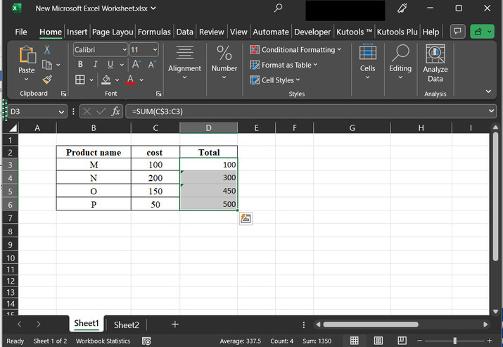 單擊D3單元格,輸入公式“=SUM(C$3:C3)”並按“Enter”鍵。這將生成以下結果。