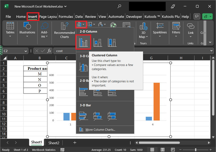 之後,轉到“插入”選項卡,然後單擊下圖中突出顯示的圖表選項。進一步選擇“二維柱形圖”選項,如下所示。