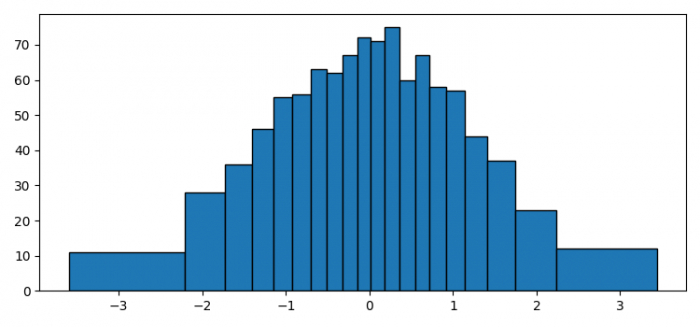 import numpy as np from matplotlib import pyplot as plt plt.rcParams["figure.figsize"] = [7.50, 3.50] plt.rcParams["figure.autolayout"] = True def equal_area(x, nbin): pow = 0.5 dx = np.diff(np.sort(x)) tmp = np.cumsum(dx ** pow) tmp = np.pad(tmp, (1, 0), 'constant') return np.interp(np.linspace(0, tmp.max(), nbin + 1), tmp, np.sort(x)) x = np.random.randn(1000) n, bins, patches = plt.hist(x, equal_area(x, 20), edgecolor='black') plt.show()