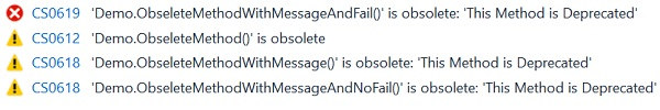 [Obsolete(string message, bool error)] - 在這種格式中,除了訊息之外,我們還可以控制編譯器是否應該在編譯時丟擲錯誤。