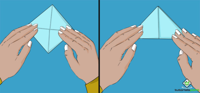 翻轉折疊好的紙張。在三角形形狀的後面,應該有兩個小襟翼伸出來。將這些小襟翼對角線摺疊。