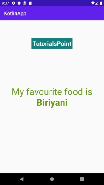 <?xml version="1.0" encoding="utf-8"?> <RelativeLayout xmlns:android="http://schemas.android.com/apk/res/android" android:id="@+id/coordinator_layout" android:layout_width="match_parent" android:layout_height="match_parent"> <TextView android:layout_width="wrap_content" android:layout_height="wrap_content" android:layout_centerHorizontal="true" android:layout_marginTop="70dp" android:background="#008080" android:padding="5dp" android:text="TutorialsPoint" android:textColor="#fff" android:textSize="24sp" android:textStyle="bold" /> <TextView android:id="@+id/textView" android:layout_width="wrap_content" android:layout_height="wrap_content" android:layout_centerInParent="true" android:layout_gravity="center" android:textAlignment="center" android:textColor="@android:color/holo_green_dark" android:textSize="36sp" /> </RelativeLayout>