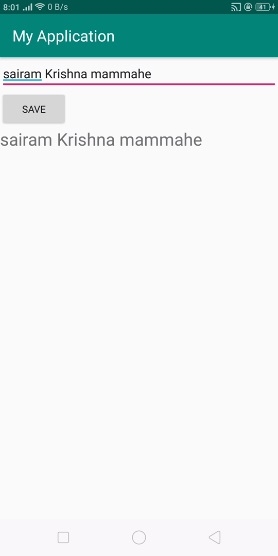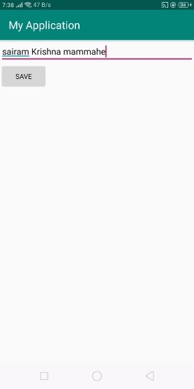 <?xml version = "1.0" encoding = "utf-8"?> <LinearLayout xmlns:android = "http://schemas.android.com/apk/res/android" xmlns:tools = "http://schemas.android.com/tools" android:layout_width = "match_parent" android:layout_height = "match_parent" tools:context = ".MainActivity" android:orientation = "vertical"> <EditText android:id = "@+id/enterText" android:hint = "Please enter text here" android:layout_width = "match_parent" android:layout_height = "wrap_content" /> <Button android:id = "@+id/save" android:text = "Save" android:layout_width = "wrap_content" android:layout_height = "wrap_content" /> <TextView android:id = "@+id/output" android:layout_width = "wrap_content" android:textSize = "25sp" android:layout_height = "wrap_content" /> </LinearLayout>