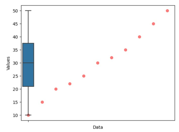 在這種方法中,我們一起使用箱形圖和箱線圖來建立全面的視覺化效果。箱形圖排列每個資料點,使它們不重疊,從而提供資料集的更清晰顯示。透過將箱形圖與箱線圖疊加,我們可以同時檢視單個數據點和彙總統計資料,從而能夠更深入地研究資料。當處理較大的資料集時,這種方法特別有用,在這些資料集中,重疊的資料點可能會掩蓋模式和趨勢。