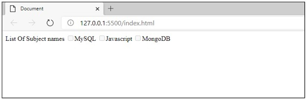 <!DOCTYPE html> <html lang="en"> <head> <meta charset="UTF-8"> <meta name="viewport" content="width=device-width, initial-scale=1.0"> <title>Document</title> </head> <link rel="stylesheet" href="//code.jquery.com/ui/1.12.1/themes/base/jquery-ui.css"> <script src="https://code.jquery.com/jquery-1.12.4.js"></script> <script src="https://code.jquery.com/ui/1.12.1/jquery-ui.js"></script> <body> <label>List Of Subject names</label> <input type="checkbox" value="MySQL" disabled=true>MySQL <input type="checkbox" value="JavaScript" disabled=true>JavaScript <input type="checkbox" value="MongoDB" disabled=true>MongoDB </body> <script> </script> </html>