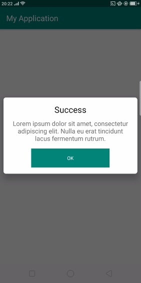 <?xml version="1.0" encoding="utf-8"?> <LinearLayout xmlns:android="http://schemas.android.com/apk/res/android" android:layout_width="match_parent" android:layout_height="match_parent" android:orientation="vertical"> <LinearLayout android:layout_width="match_parent" android:layout_height="wrap_content" android:orientation="vertical" android:padding="16dp"> <TextView android:layout_width="match_parent" android:layout_height="wrap_content" android:text="Success" android:textAlignment="center" android:textAppearance="@style/TextAppearance.AppCompat.Headline" /> <TextView android:layout_width="match_parent" android:layout_height="wrap_content" android:layout_marginTop="10dp" android:text="Lorem ipsum dolor sit amet, consectetur adipiscing elit. Nulla eu erat tincidunt lacus fermentum rutrum." android:textAlignment="center" android:textAppearance="@style/TextAppearance.AppCompat.Medium" /> <Button android:id="@+id/buttonOk" android:layout_width="200dp" android:layout_height="wrap_content" android:layout_gravity="center" android:layout_marginTop="15dp" android:background="@color/colorPrimary" android:text="Ok" android:textColor="#FFF" /> </LinearLayout> </LinearLayout>