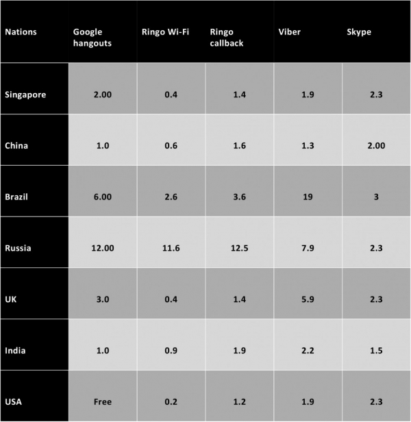 以下是流行的語音通話應用程式提供的語音通話費率(每分鐘幾分)的比較
