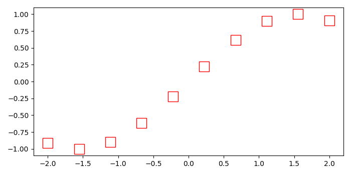 import numpy as np from matplotlib import pyplot as plt plt.rcParams["figure.figsize"] = [7.00, 3.50] plt.rcParams["figure.autolayout"] = True x = np.linspace(-2, 2, 10) y = np.sin(x) fig = plt.figure() ax1 = fig.add_subplot(111) ax1.plot(x, y, 'ks', markerfacecolor='none', ms=15, markeredgecolor='red') plt.show()
