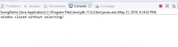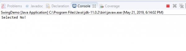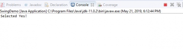 }上面,我們在控制檯中顯示了一條訊息,如果使用者選擇“是”按鈕。以下是一個示例,讓 JOptionPane 處理“是”、“否”和“關閉”按鈕 –