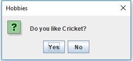 int res = JOptionPane.showOptionDialog(new JFrame(), "Do you like Cricket?", "Hobbies",