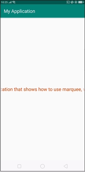 <?xml version = "1.0" encoding = "utf-8"?> <RelativeLayout xmlns:android = "http://schemas.android.com/apk/res/android" xmlns:tools = "http://schemas.android.com/tools" android:layout_width = "match_parent" android:gravity = "center" android:layout_height = "match_parent"> <TextView android:id = "@+id/text" android:textSize = "20dp" android:textAlignment = "center" android:layout_width = "match_parent" android:ellipsize = "marquee" android:fadingEdge = "horizontal" android:marqueeRepeatLimit = "marquee_forever" android:scrollHorizontally = "true" android:textColor = "#ff4500" android:text = "Simple application that shows how to use marquee, with a long text" android:layout_height = "wrap_content" android:singleLine = "true" /> </RelativeLayout>