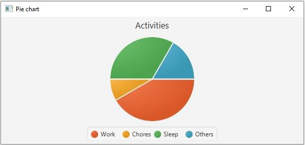 在餅圖中,我們用圓的切片來表示資料值。每個切片都與其它切片不同(通常用顏色區別)。在 JavaFX 中,可以透過例項化 javafx.scene.chart.PieChart 類建立餅圖。