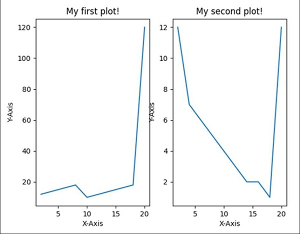 from matplotlib import pyplot as plt import numpy as np xPoints = np.array([2, 4, 6, 8, 10, 12, 14, 16, 18, 20]) y1Points = np.array([12, 14, 16, 18, 10, 12, 14, 16, 18, 120]) y2Points = np.array([12, 7, 6, 5, 4, 3, 2, 2, 1, 12]) plt.subplot(1, 2, 1) # row 1, col 2 index 1 plt.plot(xPoints, y1Points) plt.title("My first plot!") plt.xlabel('X-axis ') plt.ylabel('Y-axis ') plt.subplot(1, 2, 2) # index 2 plt.plot(xPoints, y2Points) plt.title("My second plot!") plt.xlabel('X-axis ') plt.ylabel('Y-axis ') plt.show()