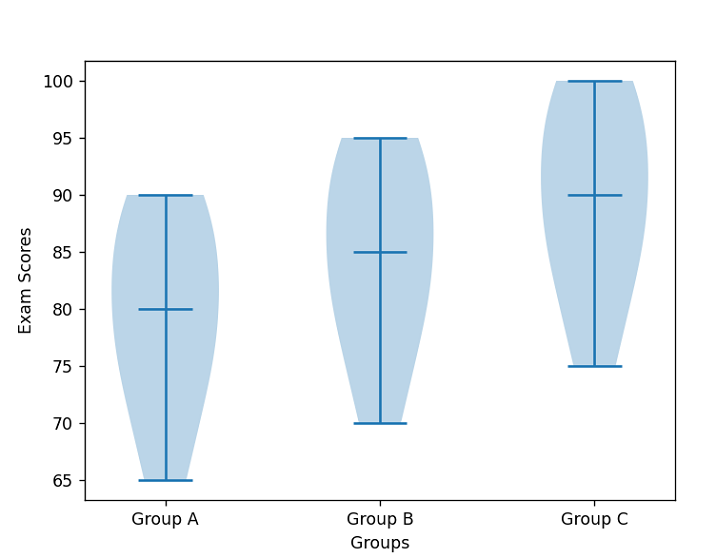 data = {'Group A': [75, 80, 85, 90, 70, 65, 90, 85, 80, 75], 'Group B': [80, 85, 90, 95, 75, 70, 95, 90, 85, 80], 'Group C': [85, 90, 95, 100, 80, 75, 100, 95, 90, 85], }