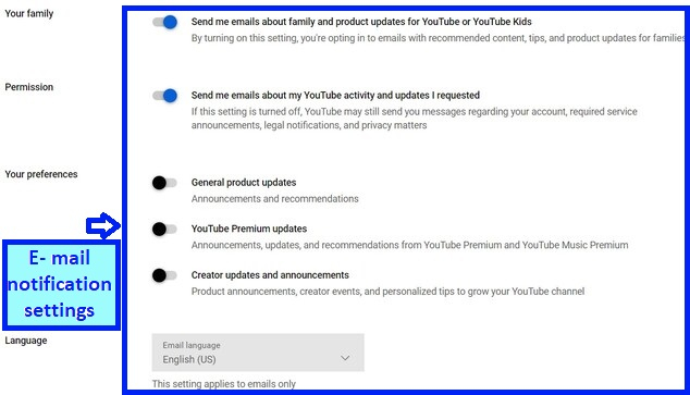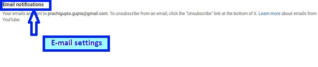 向下滾動頁面時,您將看到電子郵件通知的部分。YouTube 會告訴您所有來自它的郵件將傳送到的電子郵件地址。