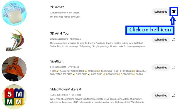 將開啟訂閱頻道列表。點選您已訂閱的 YouTube 頻道右側的 YouTube 通知鈴鐺圖示。