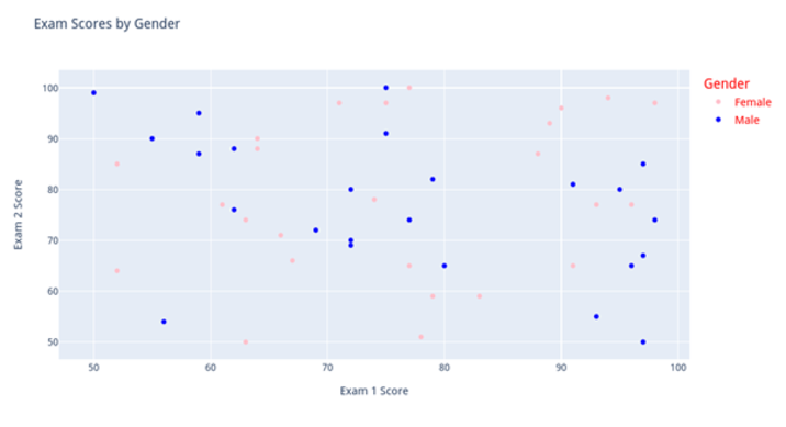 import plotly.express as px import pandas as pd import numpy as np # create a sample dataset data = {'Exam 1 Score': np.random.randint(50, 101, 50), 'Exam 2 Score': np.random.randint(50, 101, 50), 'Gender': np.random.choice(['Male', 'Female'], 50)} df = pd.DataFrame(data) # create a scatter plot with colored markers fig = px.scatter(df, x='Exam 1 Score', y='Exam 2 Score', color='Gender', color_discrete_map={'Male': 'blue', 'Female': 'pink'}, title='Exam Scores by Gender') # Set legend color to black fig.update_layout(legend_font_color='red') # Set legend font size to 14 fig.update_layout(legend_font_size=14) # display the plot fig.show()