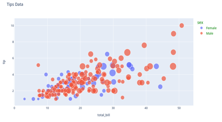 import plotly.express as px # load tips dataset df = px.data.tips() # create a scatter plot with size-scaled markers fig = px.scatter(df, x='total_bill', y='tip', size='size', color='sex', title='Tips Data') # customize plot layout fig.update_layout(legend_font_color='green', legend_font_size=14) # display the plot fig.show()