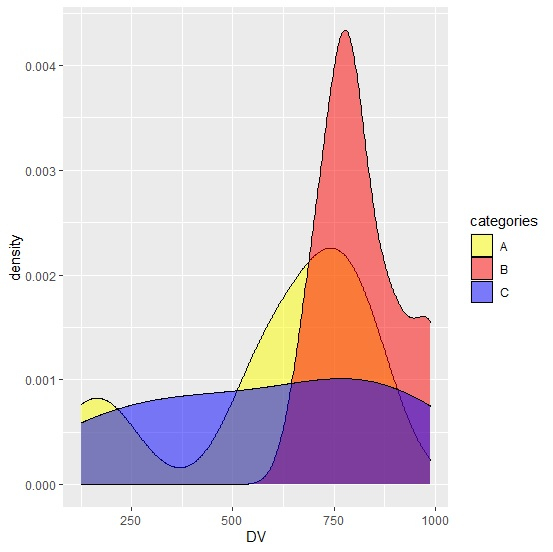 library(ggplot2) categories<-sample(LETTERS[1:3],20,replace=TRUE) DV<-sample(1:1000,20) df<-data.frame(categories,DV) ggplot(df,aes(DV))+geom_density(aes(fill=categories),alpha=0.5)