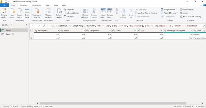 單擊“合併”磁貼,然後展開“合併查詢”磁貼,並選擇“合併查詢”選項,如下面的影像所示 -