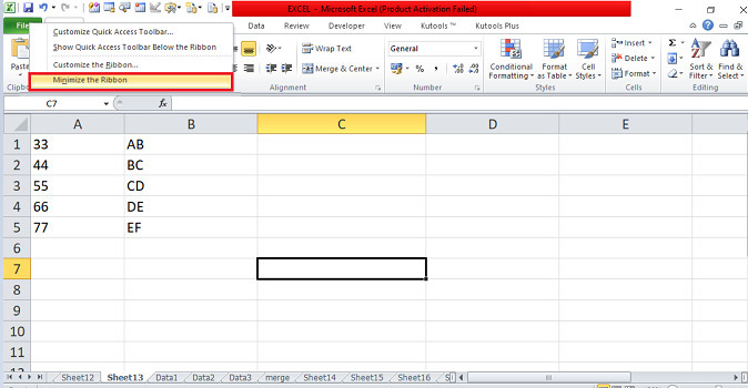 在工作表中,將游標放置在功能區上。功能區頂部角落包含許多選項卡。將游標放置在功能區的頂部角落並右鍵單擊它。選單中包含許多選項。將游標放置在“**最小化功能區**”選項卡上並單擊它,這將自動最小化或隱藏功能區,如下所示。