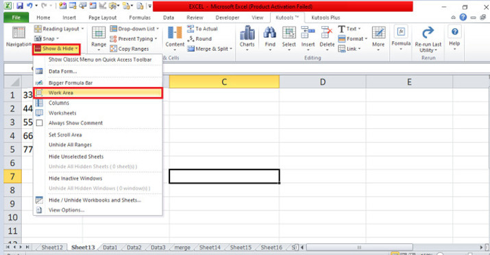 要最小化功能區,請將游標放置在功能區上。功能區頂部角落包含許多選項卡。將游標放置在“**Ku-tools**”選項卡上並單擊包含許多選項的選項卡。在“**Ku-tools**”選項卡上,將游標放置在“**顯示和隱藏**”選項卡上,該選項卡在“範圍和單元格”組中有一個下拉選單。單擊選單並選擇“**工作區**”選項卡,這將在右側角落開啟一個窗格,如下所示。