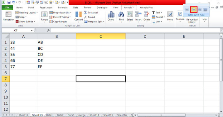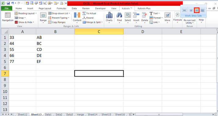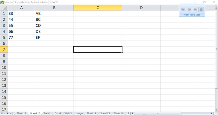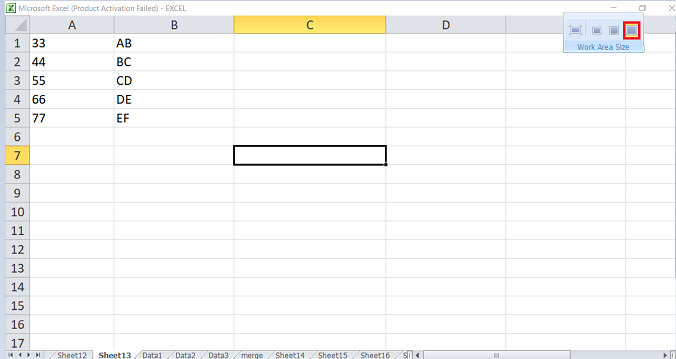 在工作表中,將游標放置在窗格中,然後選擇角落中的第一個“**工作區大小**”。單擊它後,它將最小化功能區以及狀態列,如下所示。