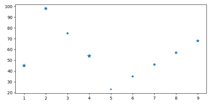 import pandas as pd from matplotlib import pyplot as plt plt.rcParams["figure.figsize"] = [7.00, 3.50] plt.rcParams["figure.autolayout"] = True columns = ["data1", "data2", "data3"] df = pd.read_csv("input.csv", usecols=columns) fig = plt.figure() ax = fig.add_subplot(111) ax.scatter(df.data1, df.data2, df.data3, marker="*") plt.show()