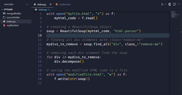 #imports from bs4 import BeautifulSoup import requests # Read the HTML file with open("myfile.html", "r") as f: myhtml_code = f.read() # creating a BeautifulSoup object soup = BeautifulSoup(myhtml_code, "html.parser") # finding all div elements with class="remove-me" mydivs_to_remove = soup.find_all("div", class_="remove-me") # removing each div element from the soup for div in mydivs_to_remove: div.decompose() # saving the modified HTML code to a file with open("yourmodifiedfile.html", "w") as f: f.write(str(soup))