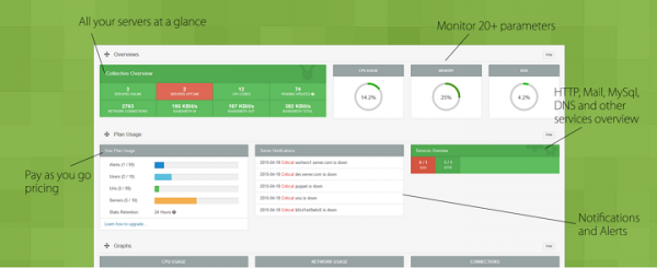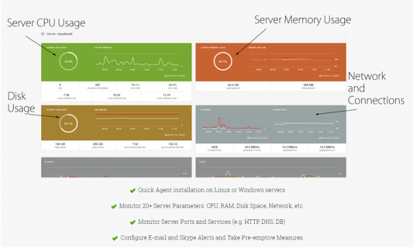 無論您的伺服器位於何處以及在何處啟動,您始終可以登入 CloudStats 帳戶以檢視有關伺服器的完整資訊,包括 CPU、磁碟、記憶體、網路使用情況,還可以監控伺服器上對監控至關重要的 Apache、DNS、MySQL、郵件、FTP 等服務。一旦您的伺服器或服務宕機,它將透過電子郵件或簡訊傳送警報。或者,您可以透過 Skype 聊天訊息接收警報。