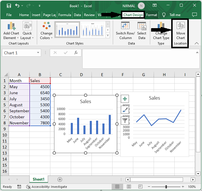 在這裡,我們將使用圖表工具來完成任務。讓我們來看一個簡單的過程,學習如何在Excel中將特定圖表移動到新工作表。