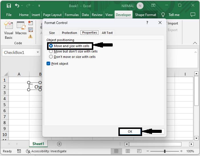 然後將複選框移動到連結單元格附近,然後右鍵單擊該框並選擇“設定單元格格式”。然後單擊“屬性”並選擇“隨單元格移動和大小調整”,然後單擊“確定”。