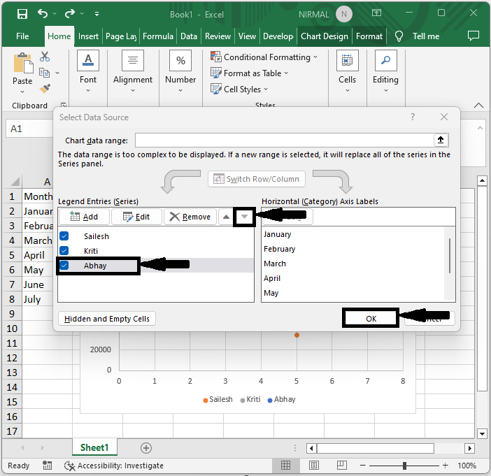 然後在圖例條目部分選擇要移到前面的系列名稱,並將其移動到最後。您可以使用箭頭標記移動系列。