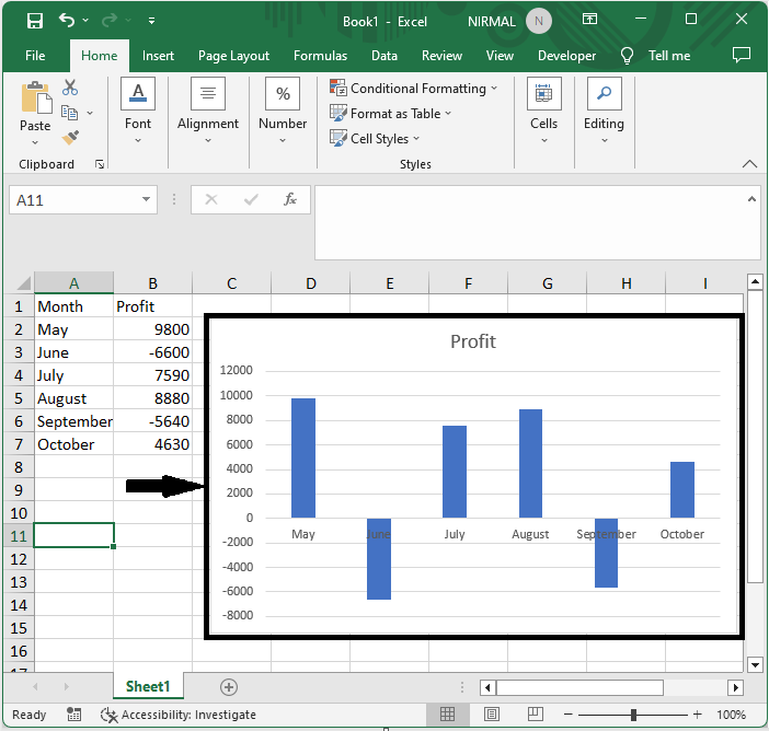 考慮一個 Excel 表格,其中包含具有類似負值的柱狀圖。