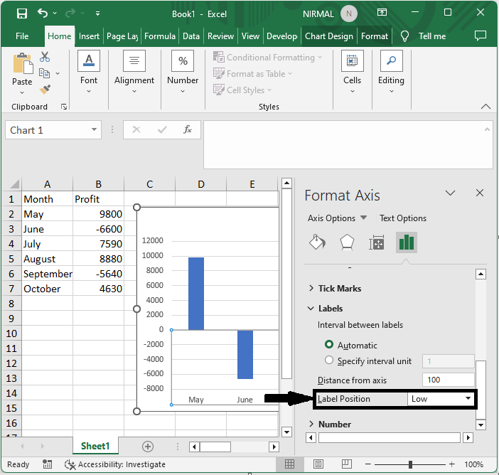 然後單擊標籤,將標籤位置更改為低,然後關閉設定座標軸格式。