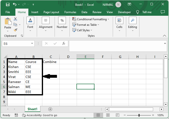 這裡我們將使用連線公式來完成任務。因此,讓我們來看一個簡單的過程,瞭解如何在 Excel 中將多個單元格合併到一個單元格中。
