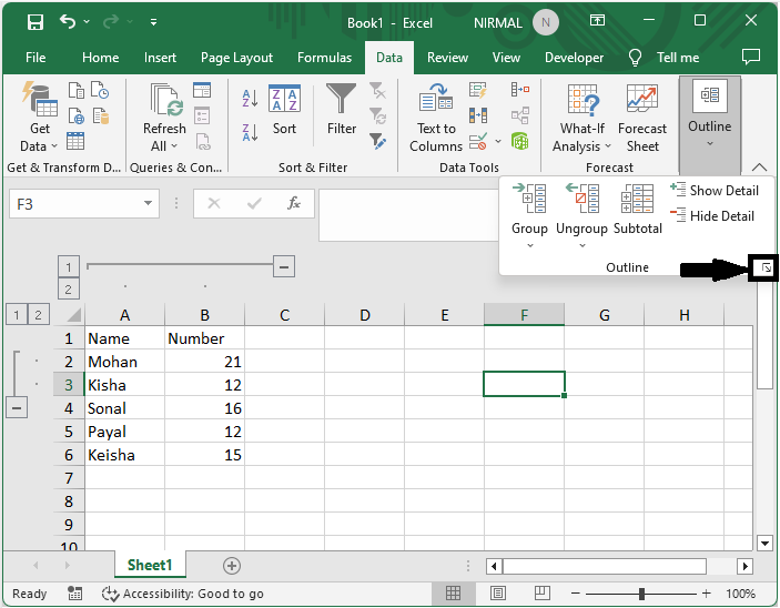 首先,單擊“資料”,然後單擊“大綱”下的箭頭標記以開啟大綱設定。